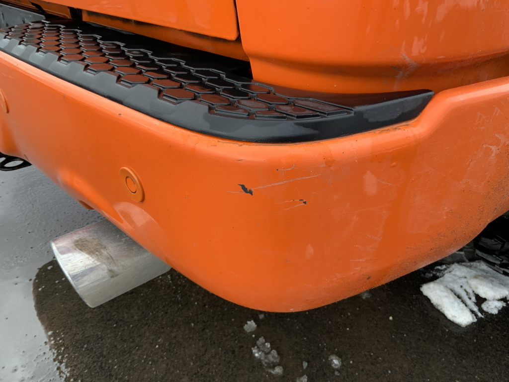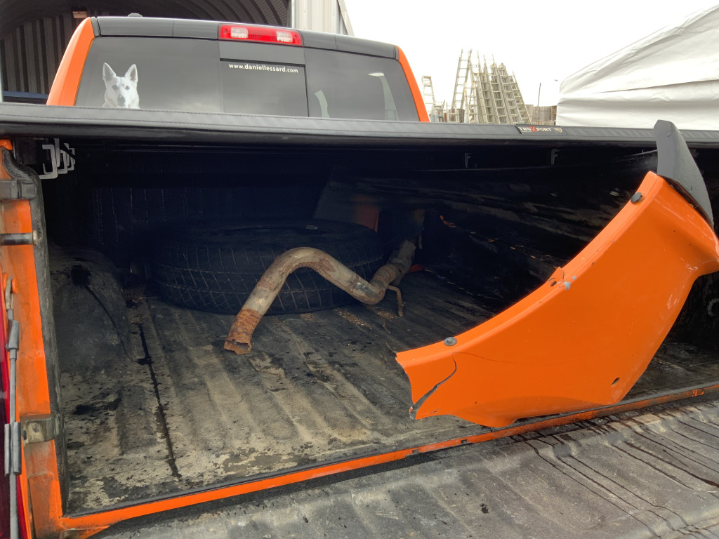 Des morceaux d’un système d’échappement et la roue de secours dans le boite